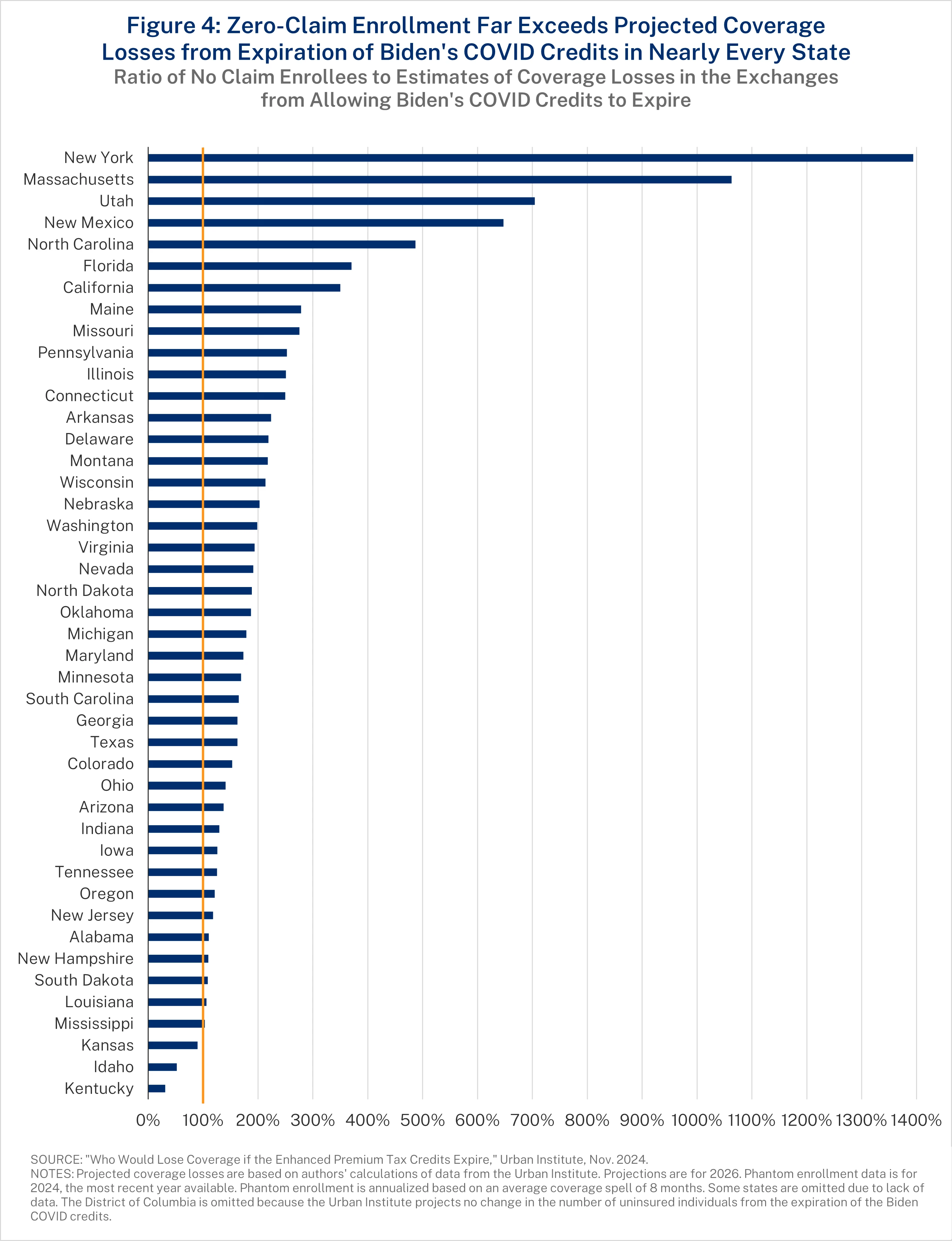 As a result of Biden’s COVID credits, there was a surge in enrollees with coverage who received no care. In fact, two in five enrollees in fully subsidized Obamacare plans did not use their coverage at all in 2024—not for a single doctor visit, test, or prescription. In a new policy brief from Paragon, Niklas Kleinworth, John R. Graham, and Liam Sigaud uncover how these zero-claim enrollees cannot be explained by a surge of young, healthy enrollees without health care needs. The increase in zero-claim enrollees between 2021 and 2024 is more than double the increase in enrollees under 35 years of age. Rather, many of these enrollees are phantoms—people unaware of their coverage or enrolled in other plans. Paragon estimates that more than 6.4 million individuals were fraudulently enrolled in exchange plans during 2025. These are people who claimed incomes between 100 and 150 percent of the federal poverty level to qualify for a fully subsidized 94% actuarial value plan, even though they did not earn that income. They found a very strong positive correlation between zero-claim and fraudulent enrollees by state (a correlation coefficient of 0.67). Of the top 20 states with zero-claim enrollees, 15 of them also ranked in the top 20 for fraudulent enrollment. The large number of zero-claim enrollees severely undercuts the argument that permitting the COVID credits to expire will harm Americans’ health. Prior work from Paragon highlighted how health coverage does not translate to improved health, but those who are unaware of even having this coverage in the first place certainly would not face any negative health effect from losing coverage. The new brief compares state projections of the increase in the uninsured if the COVID credits expire with zero claim enrollees. In all but three states, there are more zero claim enrollees (on an annualized basis) than enrollees who would lose coverage. As the figure below shows, zero-claim enrollees outnumber projected coverage losses by more than two-to-one in 17 states.